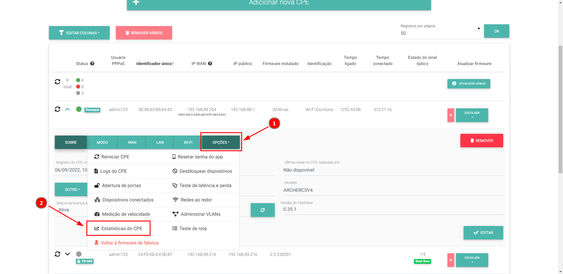 - Haga clic en “Opciones” y luego en el botón “Estadísticas del CPE”.